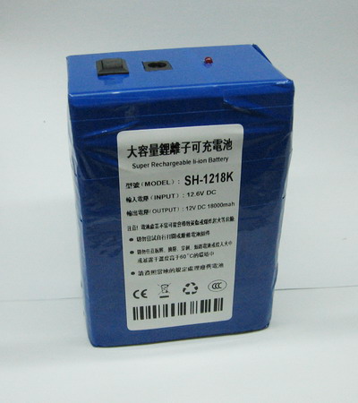与无线监控产品配套的可便携式超大容量锂电池组如SH-1218K超大容量18000MAH电池12V 电池规格:大小:100X90X40mm 电池容量:18000mA 电池使用时间: 超过100小时(传输超过200mw)输入电压:12.6V 输出电压: 12.6-10.8v 可用: 12V 电池可支持二路同时输出! 可以实现边充电边供电,即使停电了,也能保证监控摄像机继续工作数小时。也能给微型摄像机供电,实现移动监控。