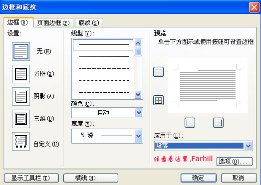 第2步,在菜单栏依次单击“格式”→“边框和底纹”菜单命令,打开“边框和底纹”对话框。在“边框”选项卡的“应用于”下拉菜单中选中“段落”选项。然后单击“设置”区域的“无”选项,并单击“确定”按钮即可去掉Word页眉横线。见下图示。