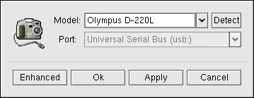 在你使用 gtKam 之前,你需要配置它来使用你的数码照相机。从菜单上选择 Camera => Add Camera...。从弹出的对话框中,你可以从拉下列表中选择你的照相机,或通过点击 Detect 让 gtKam 自动找到你的照相机。点击 Apply 来接受改变,然后点击 OK 来关闭对话框。