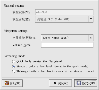 要启动 gfloppy,点击「主菜单」 => 「系统工具」 => 「软盘格式化器」。在 shell 提示下,键入 /usr/bin/gfloppy。如图 4-2所示,gfloppy 的界面很小,且只有极少选项。对多数用户来说,默认设置已经足够满足需要,然而,如果必要的话,你可以用 MS-DOS 文件系统来格式化软盘。你还可以选择你的软盘的密度(如果你使用的不是通常的高密度 3.5" 1.44MB 软盘的话)。如果这个软盘从前格式化为 ext2 的话,你还可以选择来快速格式化(quick format)该软盘。