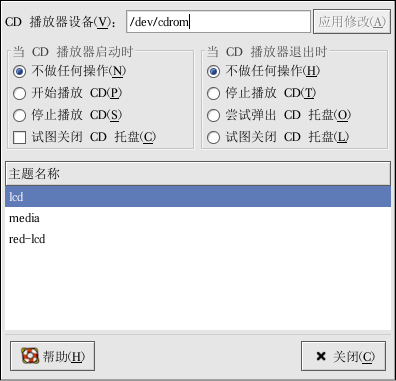 你可以通过点击「打开曲目编辑器」按钮来编辑你的光盘中的曲目列表。你还可以通过点击「打开首选项」按钮来改变程序的功能。这里,你可以为播放器设置主题,以及在你打开和退出 CD 播放器程序时你的光盘驱动器的行为方式。