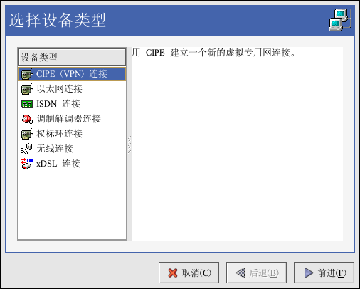 如果你要把 Red Hat Linux 计算机连接到一个带有无线(802.11x) 网卡的无线访问点(Wireless Access Point,WAP)或对等(peer-to-peer,又称 ad-hoc)网络,你就需要配置你的无线设备。选择「无线连接」,然后从提供的设备列表中选择你的设备。接下来,你便可以在弹出的设备配置窗口中把该设备配置成 DHCP 或固定的 IP 地址了。