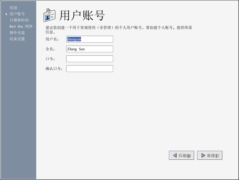 设置代理首先提示你创建一个用户账号,因此你可以用它来进行日常工作。建议你不要登录到根账号来从事普通任务,因为这有可能损坏你的系统或无意地删除文件。设置代理让你输入一个用户名、用户的全称、以及口令(你必须输入两次)。这个步骤会创建一个用户账号,它在系统上有自己的可贮存文件的主目录。你可以用它来登录入你的 Red Hat Linux 系统。