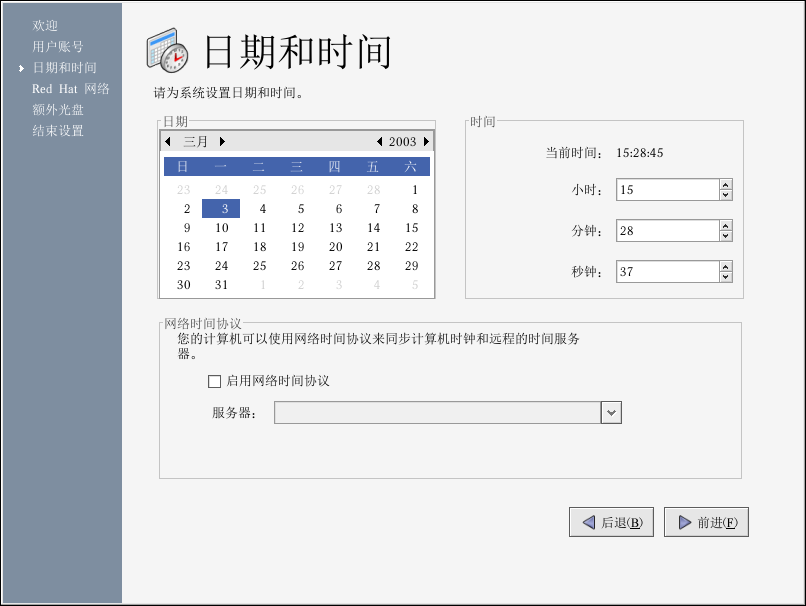 你还可以使用网络时间服务器(network time server)— 通过网络连接向你的机器传输日期和时间信息的机器 — 来同步你的时间和日期。选择标为「启用网络时间协议」的复选箱,并使用拉下菜单来选择你要使用的时间服务器。设置了时间和日期后,点击「前进」来继续。