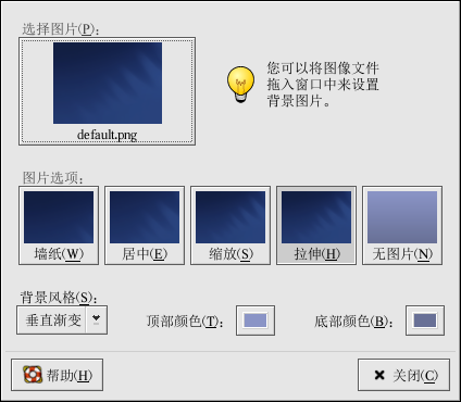 背景首选项工具允许你从所提供的图像目录(/usr/share/backgrounds/images/)中载入一个新背景。你还可以把图像从你自己的图像目录中拖放到这个窗口中。该窗口中还提供了好几种显示图像的方式。「墙纸」选项会在桌面上排列你的图像。 这在你使用小图像的时候,或要使用 /usr/share/backgrounds/tiles/ 或你自己的图像集中的壁砖(tile,或图案)时会很有用。「居中」选项把你的图像放置在桌面正中,并使用默认的背景颜色来填充剩余的桌面空间。要想不平铺图像而使它填满桌面,使用 「缩放」「拉伸」选项。图 2-11显示了 被拉伸来填满整个桌面的花树背景图像。