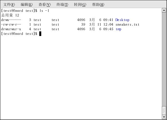 文件的所有者(这个情况下是 test)有读取和写入该文件的权限。组群 test 也有读取和写入 sneakers.txt 的权限。它不是一个程序,因此所有者和组群都没有执行它的权限。