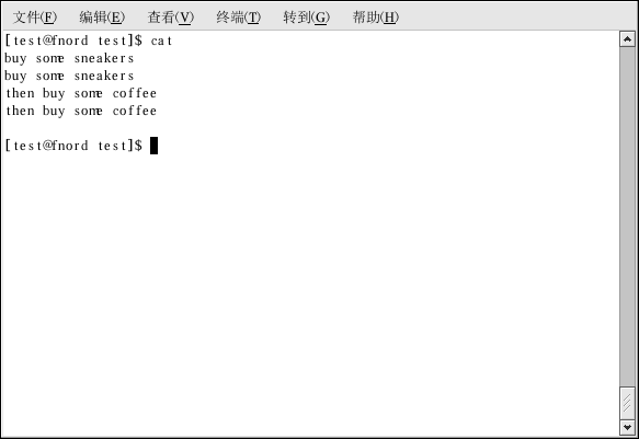 譬如,使用 cat 自身会在屏幕上输出你所输入的内容,如同是在重复你刚键入的行。下面的例子显示了 cat 会重复你输入的每一行: