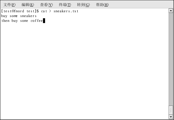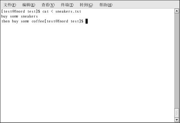 注意到图 13-6中的区别了吗?此处并没有重复显示。这是因为 cat 的标准输出已经被重导向了。重导向的地方是你刚刚制作的一个叫做 sneakers.txt 的崭新文件。