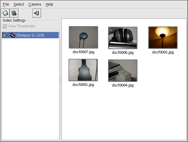 显示在图标下面的目录可能会有所不同,这要依据你的照相机品牌而定。选择你的图像通常所在的目录,这些图像就会立即作为缩略图像被载入主窗口。从这个窗口上,点击想要查看的图像。你可以通过选择 File => Save Selected Photos 来把它保存到磁盘上。如果你想保存所有贮存的图像,选择. Select => All,然后把图像保存到磁盘上。