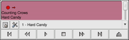 CD 播放器界面与标准的光盘播放器相似, 带有播放、暂停、和停止功能。在界面底部还有一个音量控制滑钮。 你可以按 「下一曲目」和「上一曲目」按钮来向前或向后跳过曲目;你还可以使用「曲目列表」拉下菜单来在列表中选择曲目。