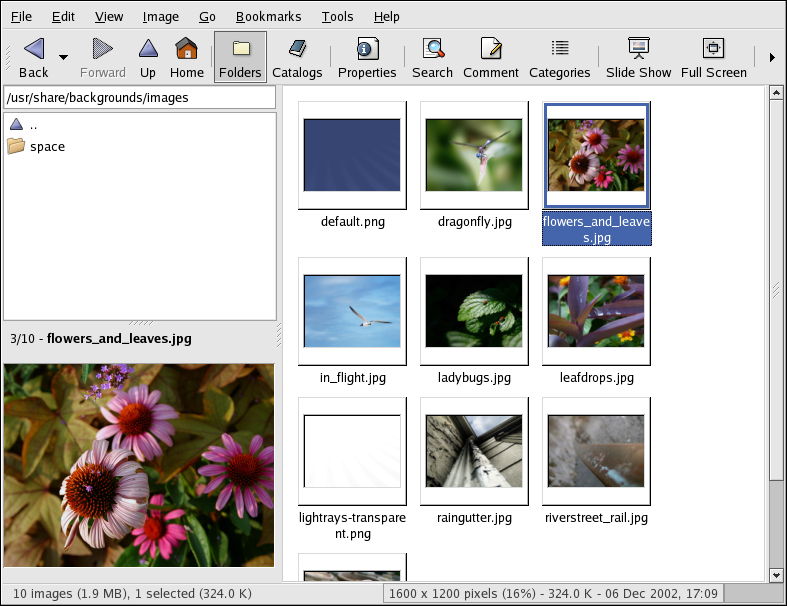 gThumb 既可用于查看单个图像文件,也可以用于浏览文件夹中的文件集合。它支持缩放功能,以及预览目录中所有图像文件的缩略图标的功能。它还支持好几种在 Nautilus 中没有的高级选项。