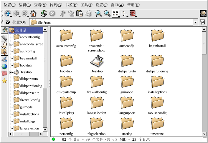 Konqueror 会在你的桌面上打开一个窗口,允许你浏览你的主目录以及 Red Hat Linux 文件系统。你可以点击工具栏上的「起始 URL」按钮来回到你的主目录。