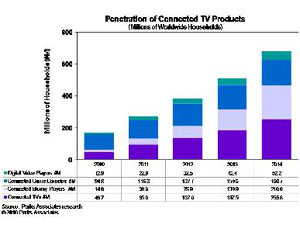 今年上半年,Sony与Samsung是网络电视市场的领导品牌,市占率分别为23%与20%;LG、Vizio与Panasonic排名在后,市占率各约 9%左右。至于专门用以链接家用电视与PC的设备,今年销售量估计可达600万台;这些设备主要是使用Wi-Fi类的技术,不过至少有两家公司的产品是采用 UWB链接技术。