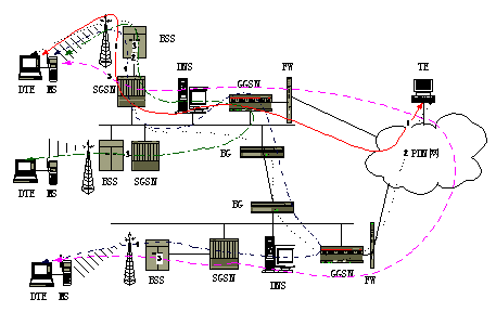在MS和SGSN之间,由SNDCP/LLC协议来路由转发分组数据单元PDU,通过TLLI/NSAPI标识来唯一识别特定用户的PDU。在SGSN和GGSN之间,利用GTP头中的TID和IP头中的GSN地址来唯一标识特定用户的PDU传输隧道。GPRS中的分组数据传输主要分为MS-PDN、MS-MS两种类型。图2描述了分组数据的路由传输方式。