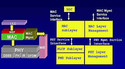 从图中可以看出,WLAN的工作层有介质访问控制层(MAC)和物理层(PHY),其中物理层又分为两个子层PLCP(物理层收敛过程)子层和PMD(物理介质相关)子层。PLCP子层通过将MAC层信息映射到PMD子层,使MAC层对物理介质的依赖性减到最低,而PMD子层则提供了对无线介质进行控制的方法和手段。无线局域网的物理层采用扩频工作方式,包括FHSS(跳频扩频)、DSSS(直接序列扩频)、HR/DSSS(高速直接序列扩频)和OFDM(正交频分复用),无线工作频段为ISM:2.4GHz-2.4785GHz以及U-NII:5.725GHz-5.850GHz(取决于采用的标准)。在IEEE802.11结构内还包含两个管理实体(MAC层管理实体MLME和物理层管理实体PLME)和管理信息库MIB(Management