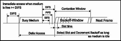 当介质忙时,每一个待发站点(STA)都会分配一个整数的退守定时值(其值是从0到竞争窗CW宽度最大值之间的一个随机整数),然后退出竞争,在后台等待介质空闲。介质空闲后,只有退守定时器已减为零值的站点才有权在介质空闲一个DIFS时间后在CW内竞争介质进行发送,而那些退守定时器还未到零的待发站点则在竞争窗内把退守定时器定时值减一。如果多个STA的退守定时器值都已为零,就会出现同时竞争。于是这些参与竞争的STA都将被重新分配一个随机退守定时值,并再次退到后台进入守候待发状态。为了保证比普通数据帧具有更高优先级的控制帧(如ACK帧和CTS帧)能够优先发送,它会在介质空闲一个比DIFS更短的SIFS时间后立即发送。由于SIFS比DIFS时间短,