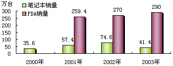 无线局域网普及率上升的另一个原因是笔记本电脑、PDA等设备的数量不断增加。笔记本电脑是目前最适用于WLAN的终端设备,笔记本电脑销售量是IT产品中增长最快的产品之一。PDA的销售量也由2001年259.4万台逐年增加到2003年的290万台,采用PDA上网的用户数量占互联网用户的8%左右,截止到2003年底,笔记本电脑用户中已经有17.6%的成为WLAN用户,而在使用PDA上网的用户中WLAN的现有用户已经占到30%。2000-2003年笔记本电脑销量和PDA销量见下图: