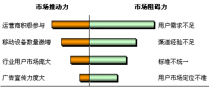 综上所述,根据各因素对WLAN市场所产生的影响程度大小赋以不同的权数,对无线局域网市场的拉动因素和阻碍因素进行对比分析,得到如下对比结果(见下图):目前市场阻碍因素的牵制作用强于拉动因素的促进作用,WLAN市场目前处于发展的瓶颈时期。