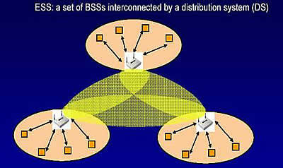 这实际上是由多个基本业务组(BSS)构成的分布式系统(DS),在逻辑链路控制层(LLC)上可等效为一个Ad-Hoc结构。在这种结构中,AP之间只负责交通转发,而站点在ESS范围内的移动,在更高层(如LLC)是不可见的。